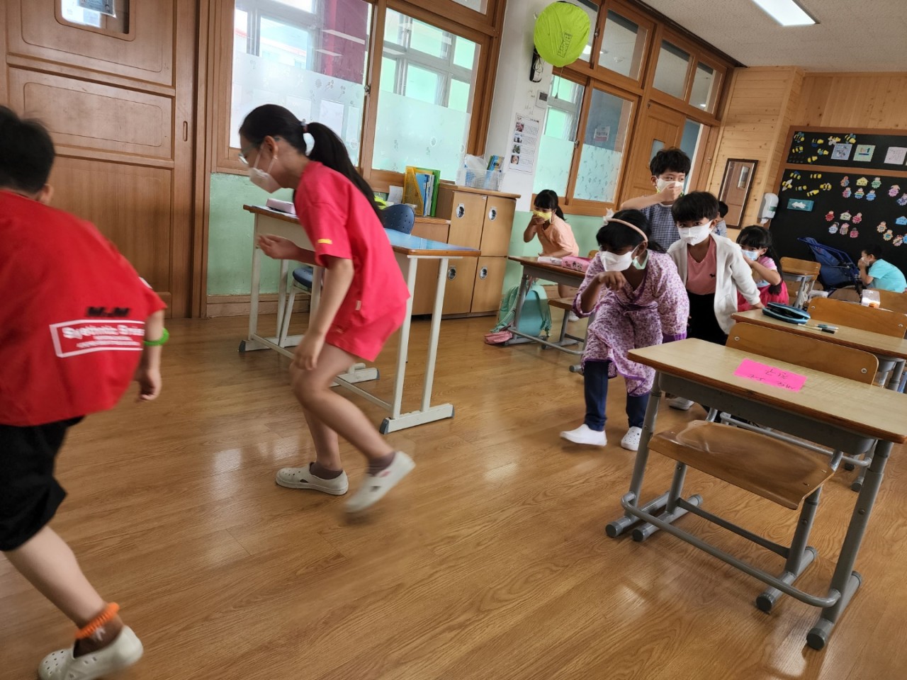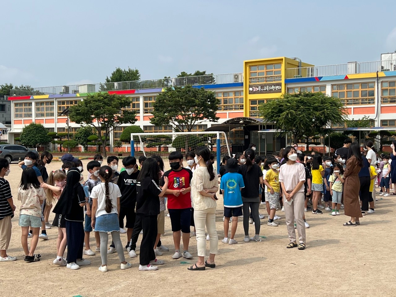 유치원생을 포한한 전교생이 참여하여 화재가 일어난 상에 어떻게 해야 할 지에 대해 배우고
