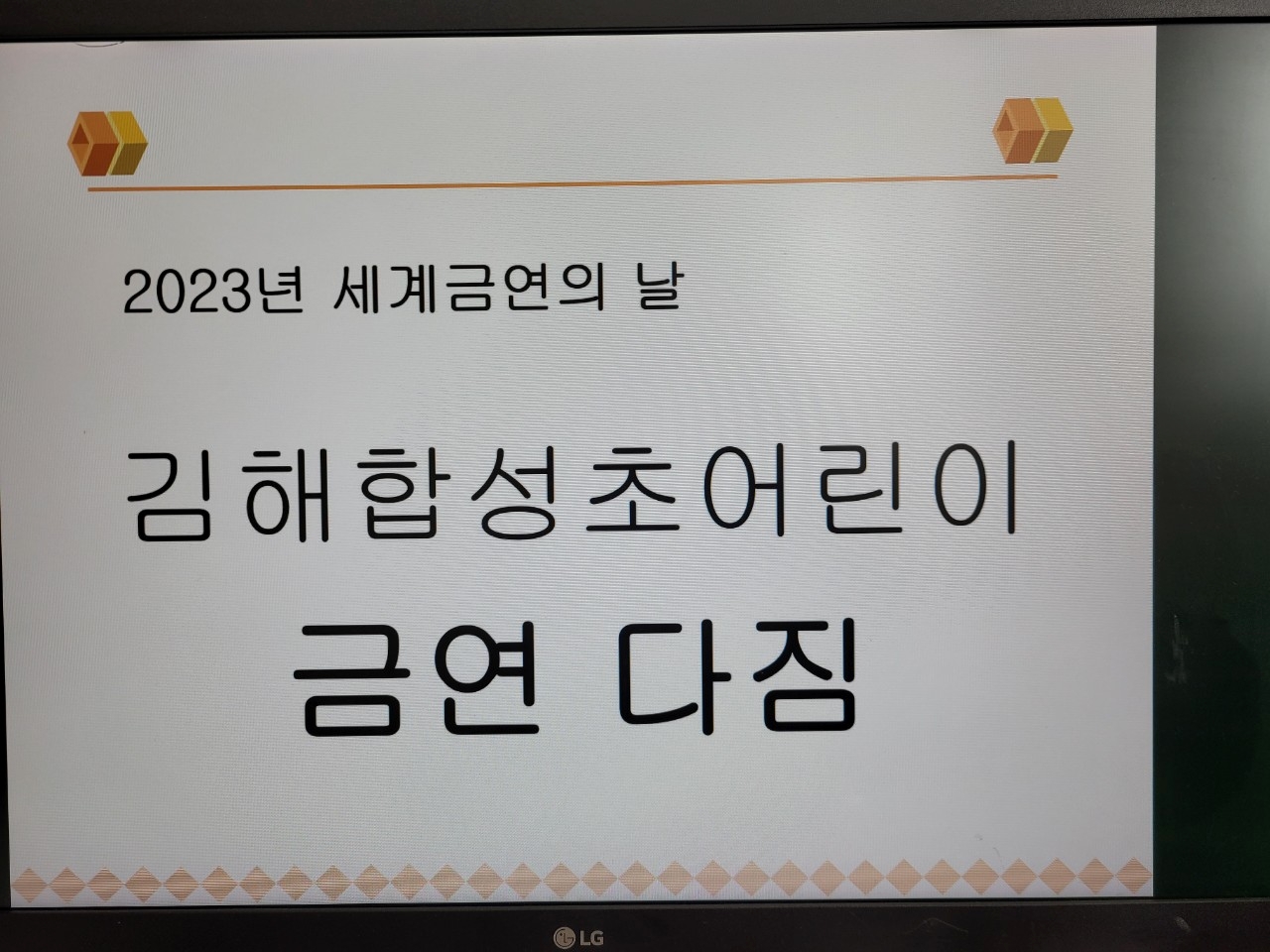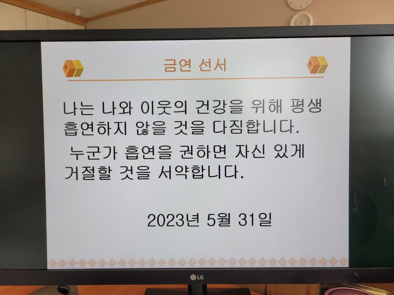 5월 31일 세계금연의날 아침방송으로 계기교육과 함께 흡연예방, 금연선서를 하였습니다.